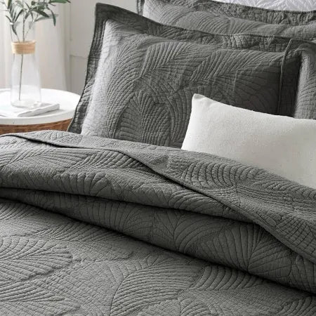 Palm Leaf Pattern Quilt Set - Elegant Grey 3-Piece Bedding